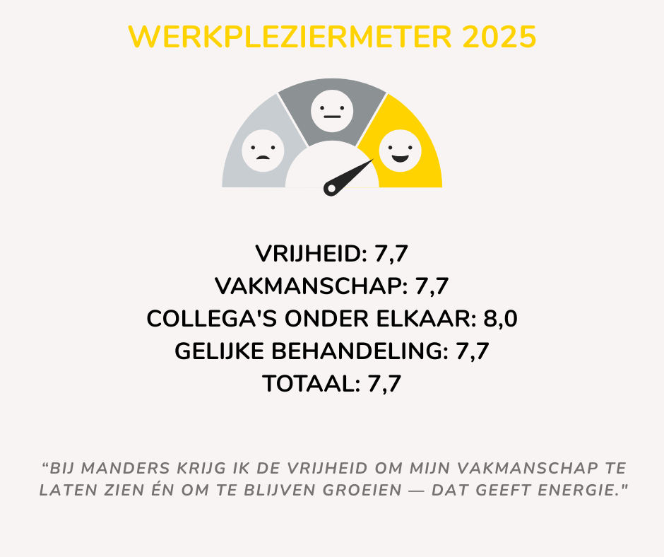 Bij Manders Totaal geloven we dat mensen pas echt kunnen excelleren als ze met plezier naar hun werk gaan. Werken is tenslotte een groot deel van je leven, dus dan is het belangrijk dat je er energie, voldoening én gezelligheid uit haalt. Daarom zetten wij ons actief in om een fijne, positieve werkomgeving te creëren.